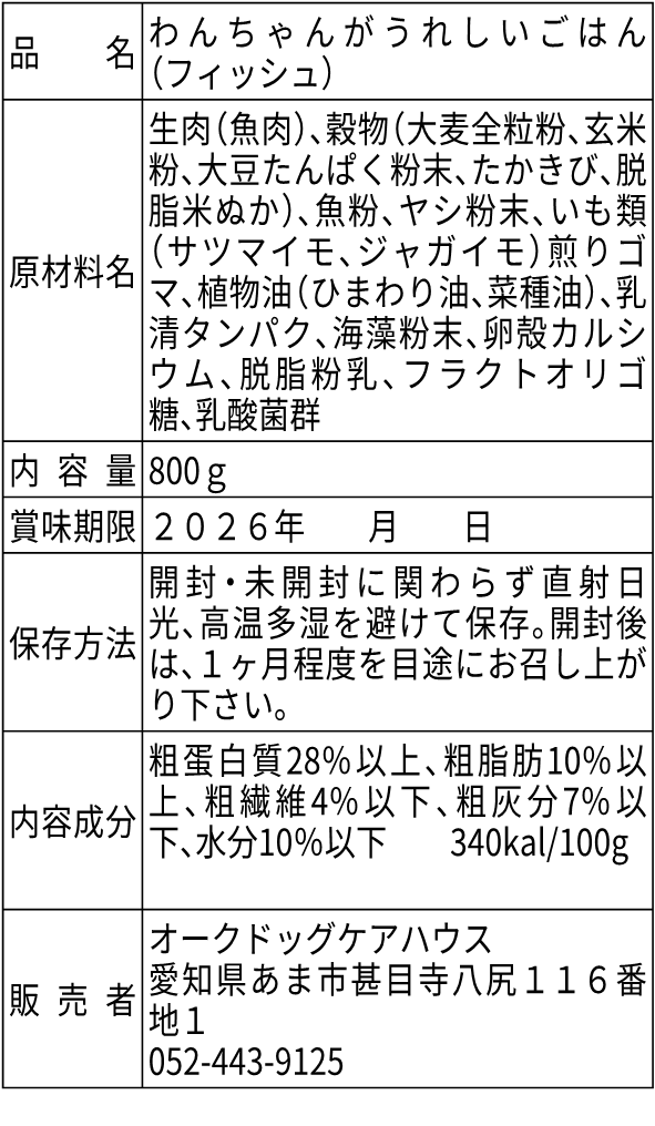 粗繊維 4%以下、粗灰分 7%以下、水分 10%以下、340kcal/100g
